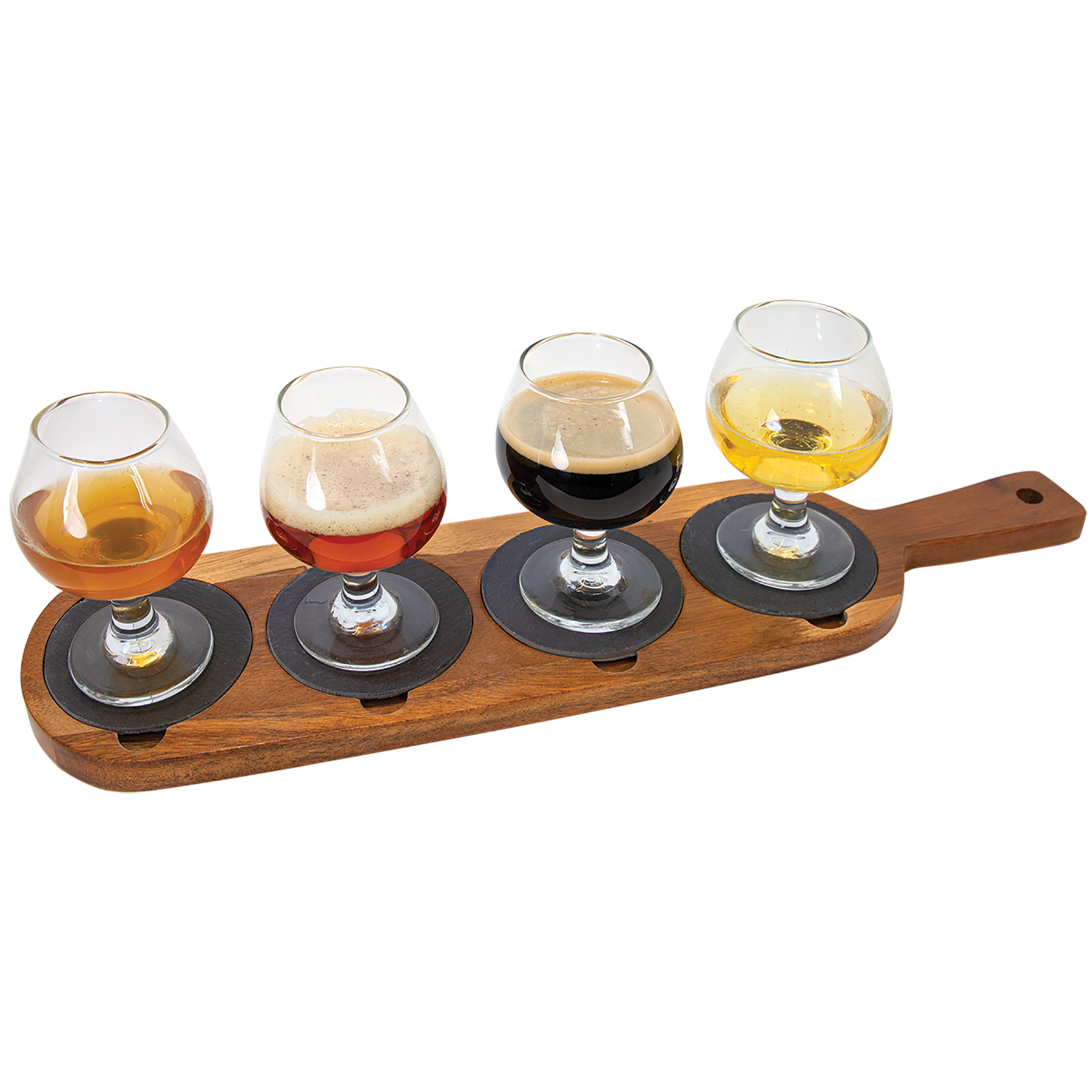 This custom 18 1/2" x 4 1/4" engraved solid wood flight serving board with handle and slate coasters can be customized to suit. A perfect flight board for any bar!  It also makes a wonderful wedding or house-warming gift as well as a beautiful, useful piece to add to your own kitchen and use to host your favorite guests. Coasters are removable.