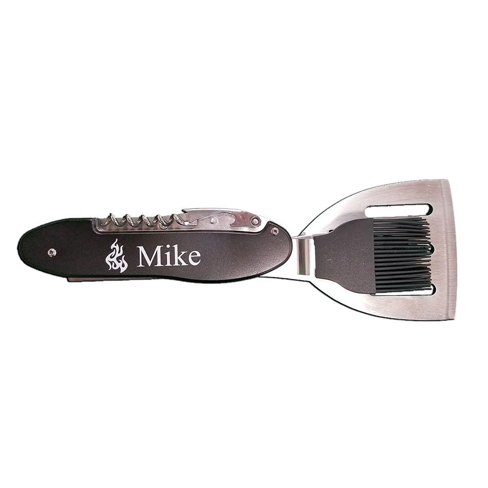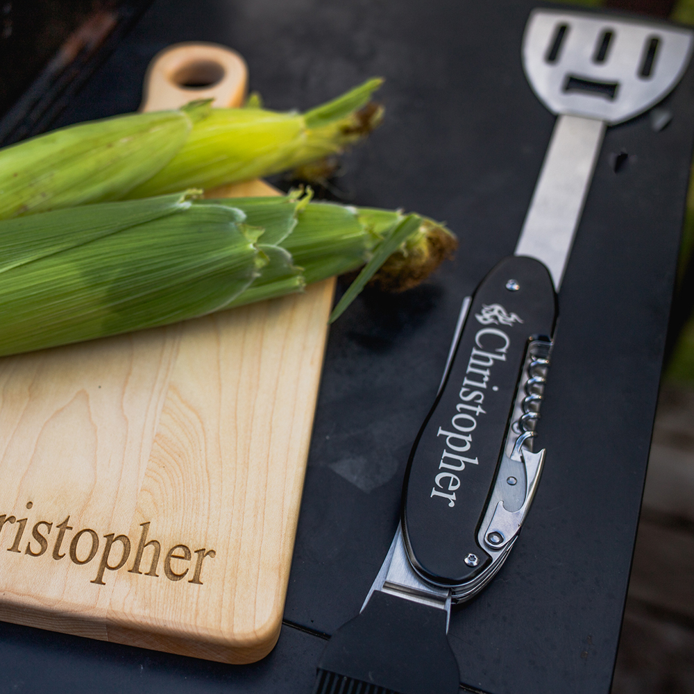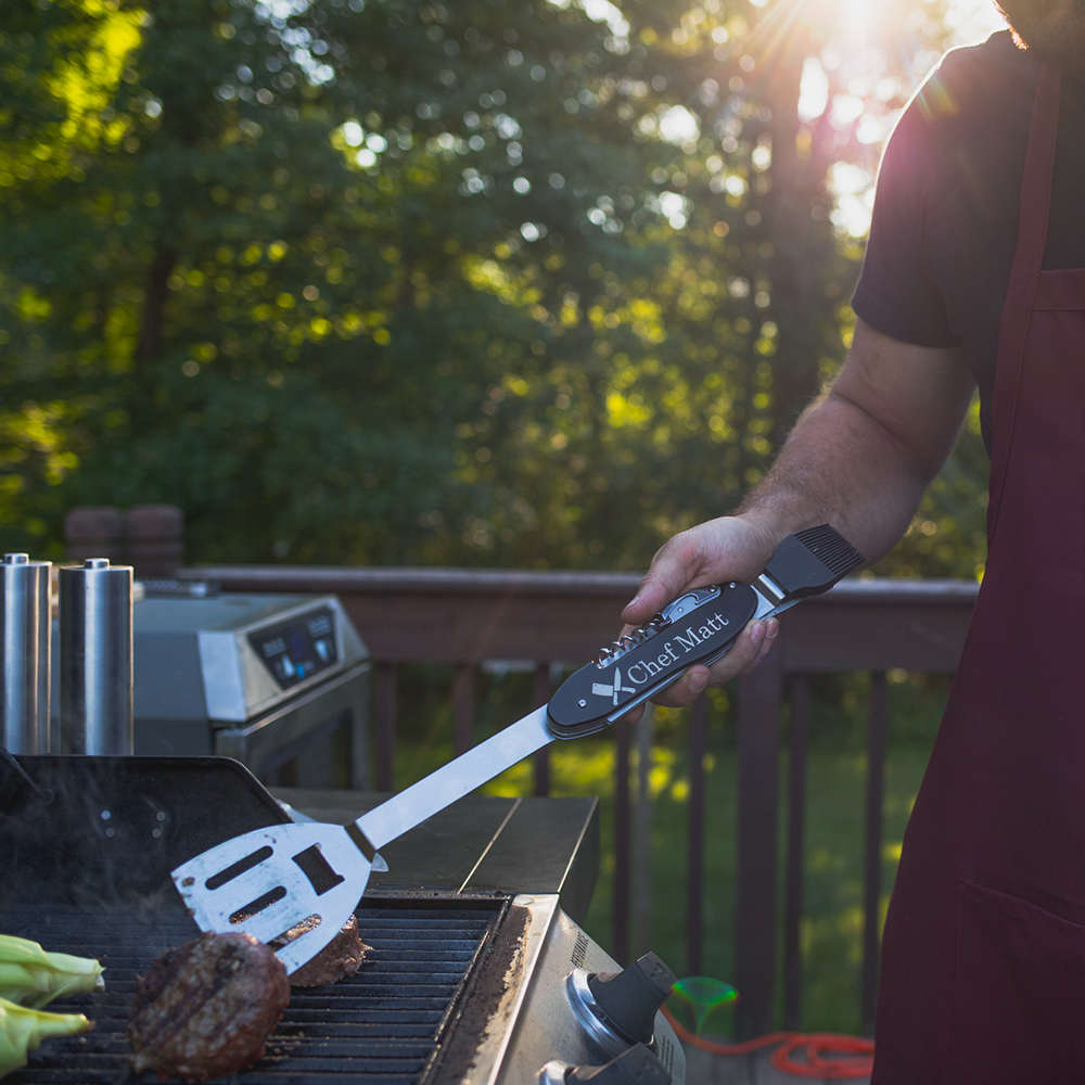 Professionally laser-engraved 5-in1 BBQ tool is personalized with your name and a symbol of your choice. This BBQ tool can match our Grill Master or Chef Knives aprons and when purchased together makes a great gift set.
