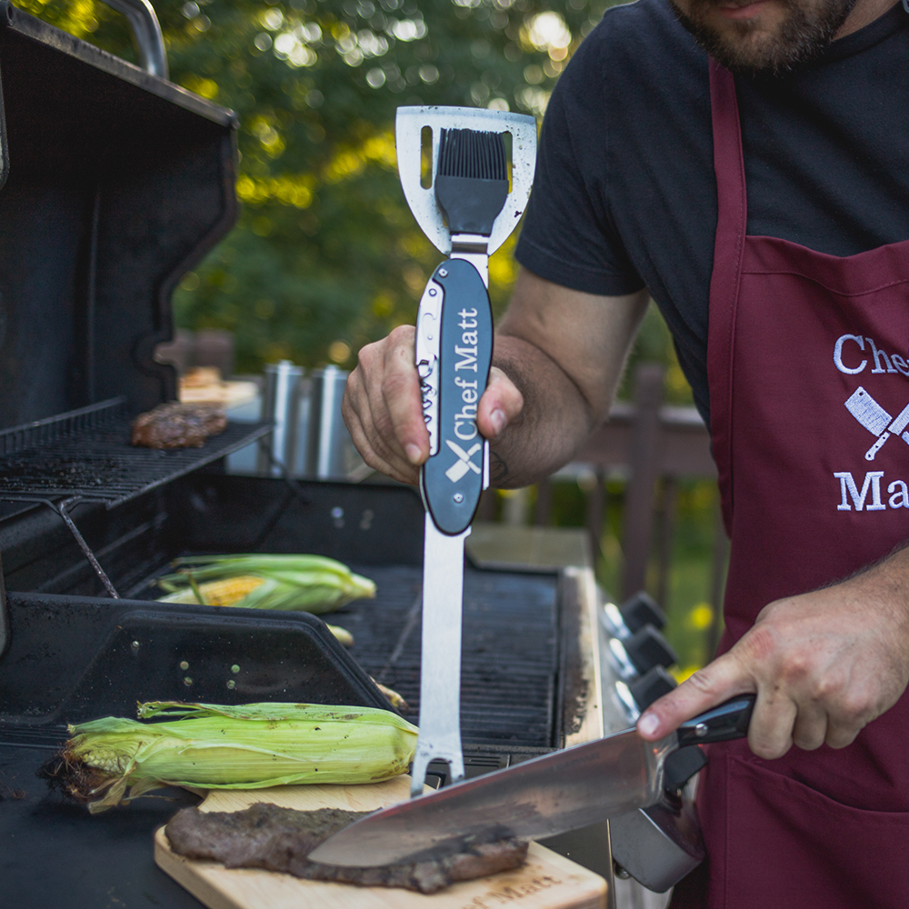 Professionally laser-engraved 5-in1 BBQ tool is personalized with your name and a symbol of your choice. This BBQ tool can match our Grill Master or Chef Knives aprons and when purchased together makes a great gift set.