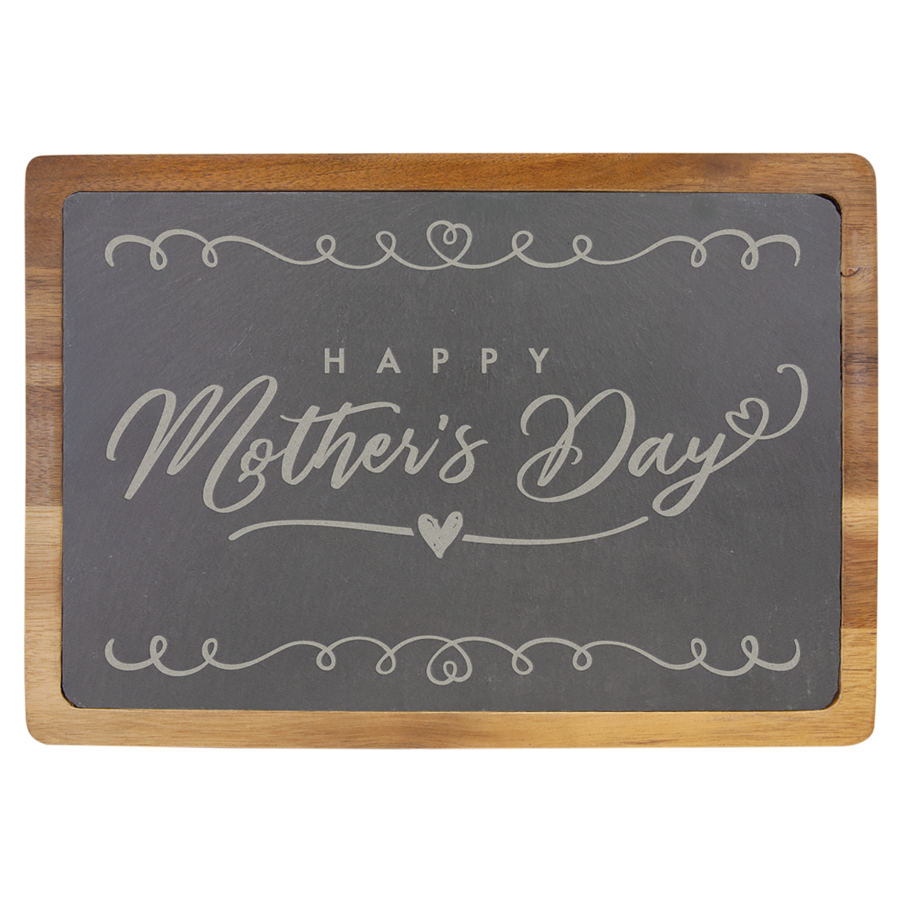 This custom 13" x 9" engraved solid wood cutting board can be customized to suit. It makes a wonderful wedding, house-warming or client gift! It is also a beautiful, useful piece to add to your own kitchen and use to host your favorite guests. This cutting board is made of slate and solid Acacia wood.