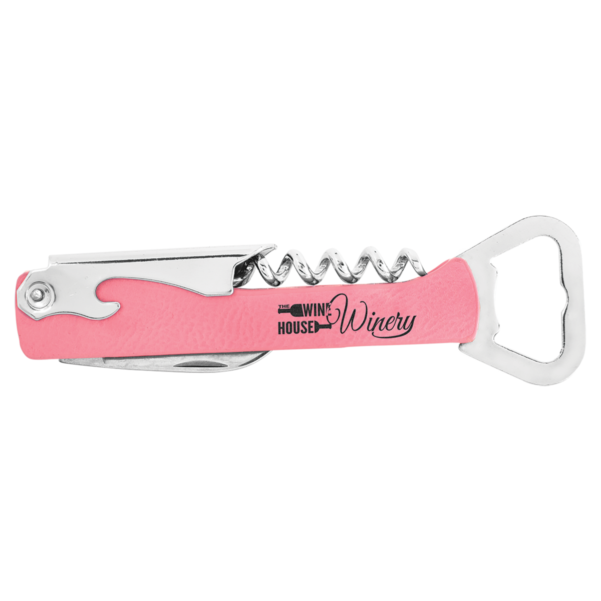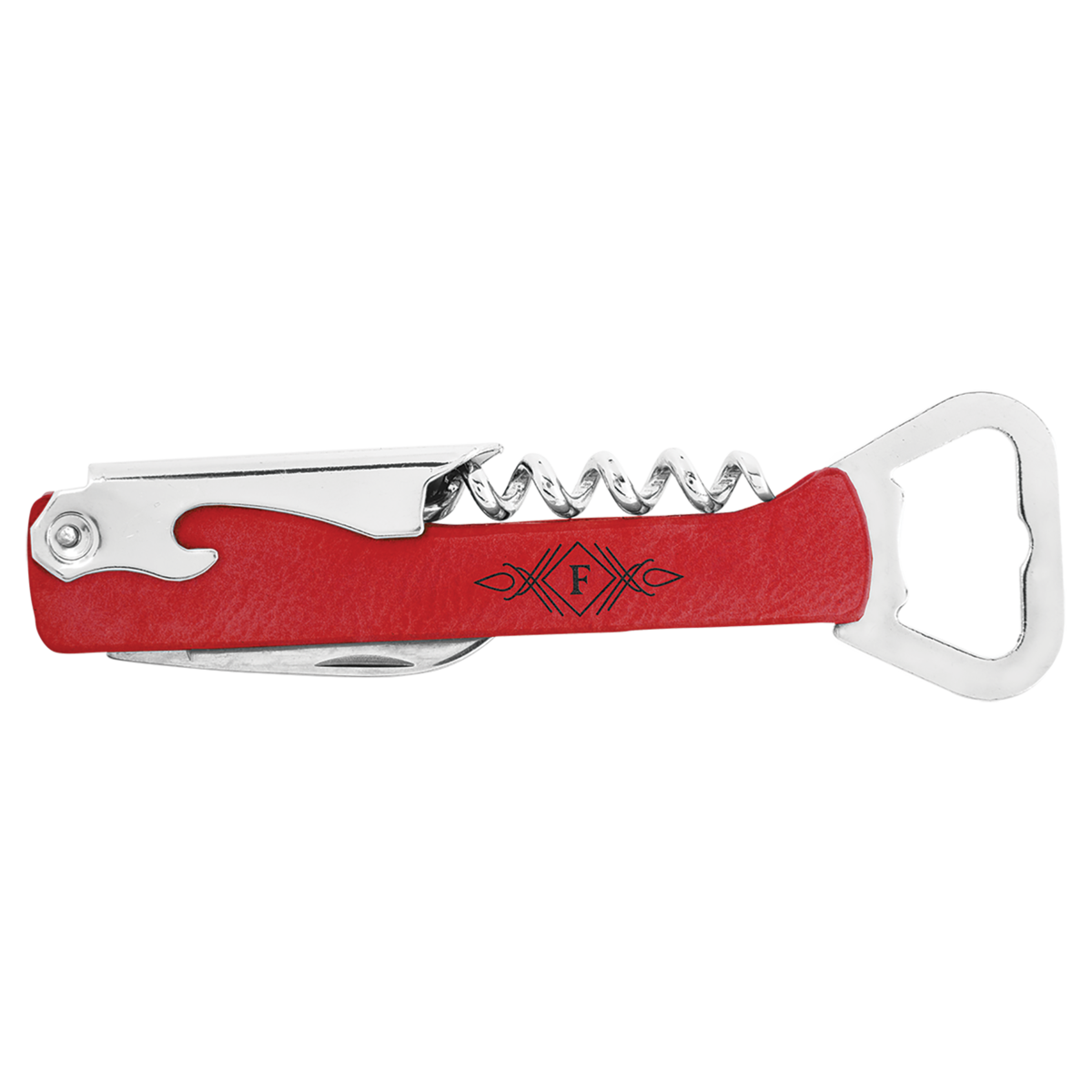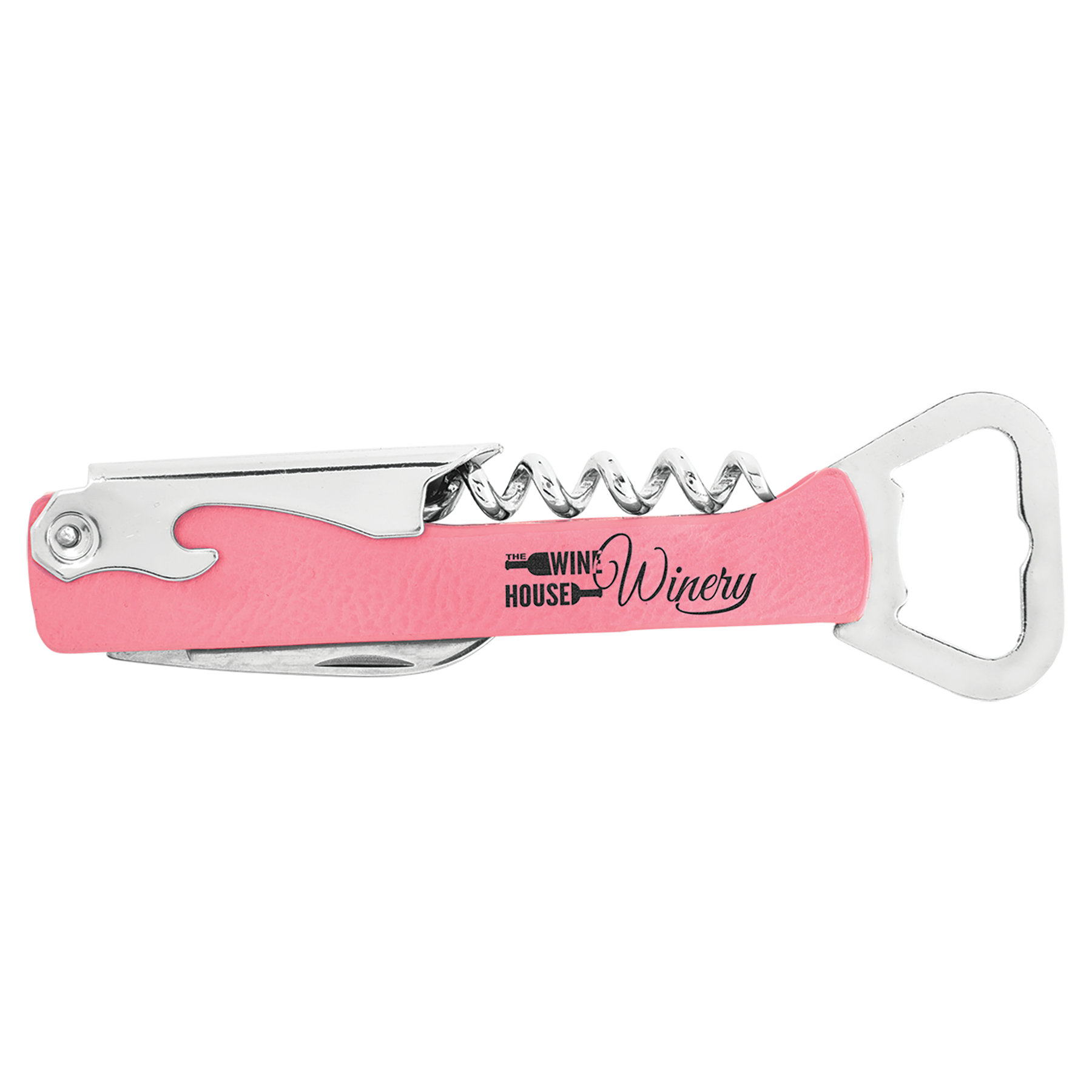 This leatherette wine and bottle opener offers the look and feel of genuine leather at a fraction of the price. This richly textured, synthetic material is water resistant, easy to clean and durable enough for the rigors of daily use. The high quality workmanship of each leatherette piece is sure to impress every recipient with its elegant individuality. This opener can be personalized through laser engraving.  Great for client, birthday and batchlor/batchorette gifts.  Pair with a bottle of wine in a basket for the perfect gift!