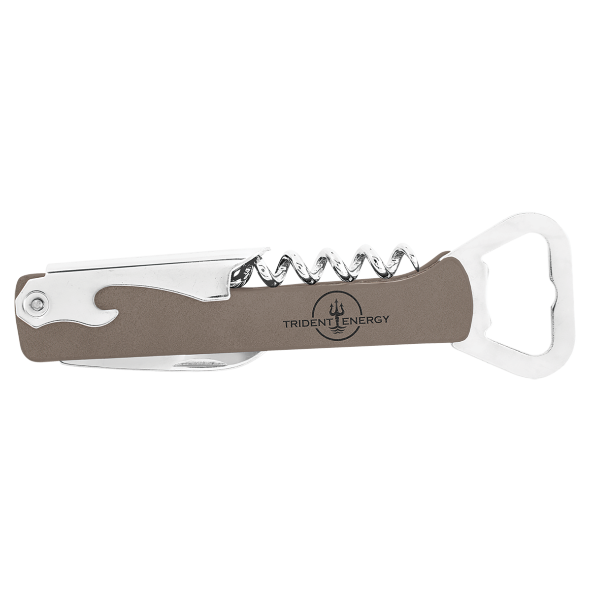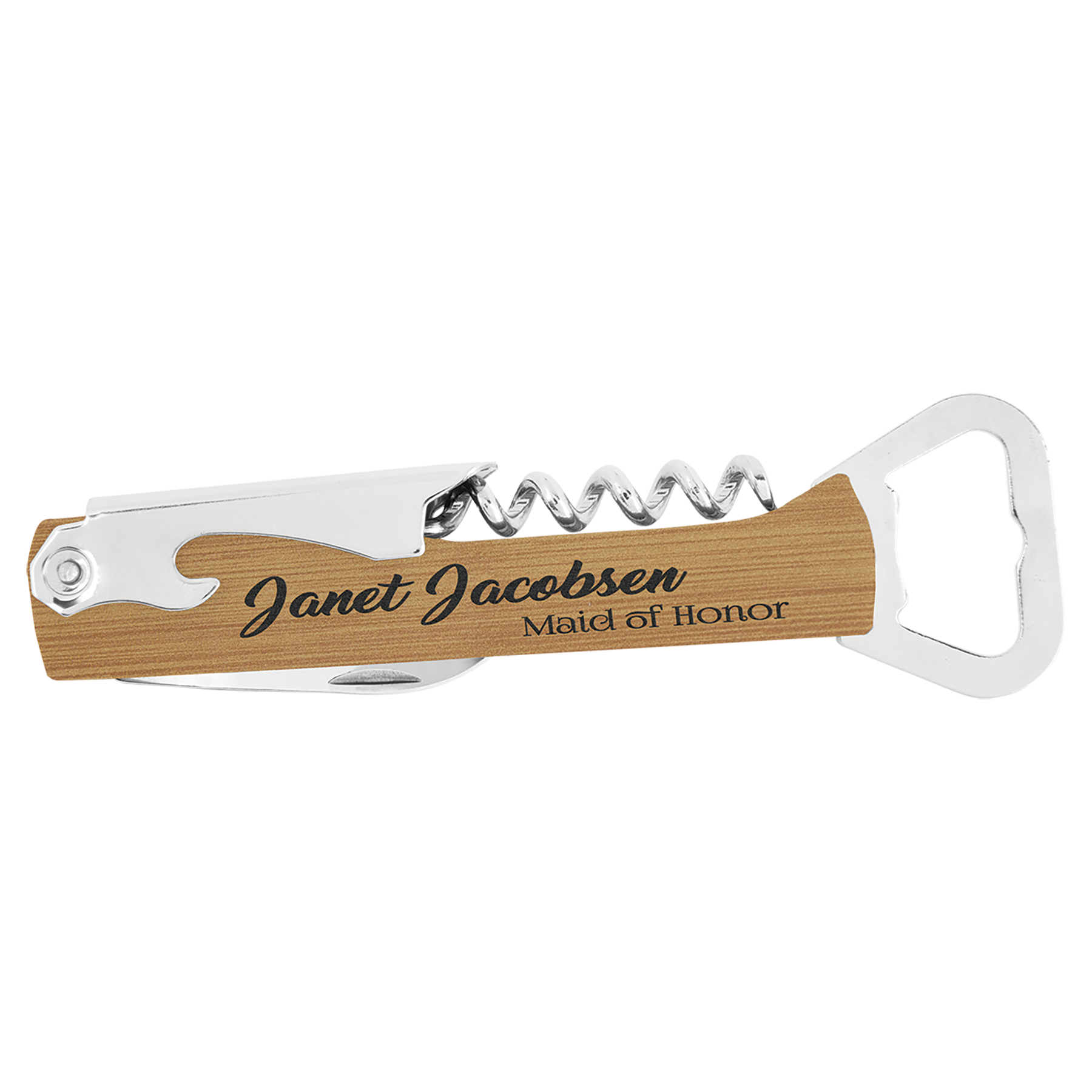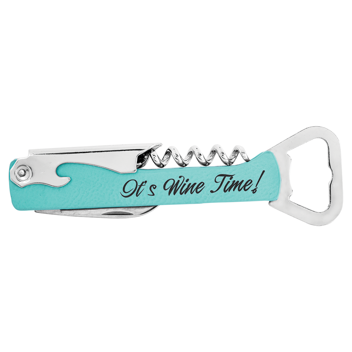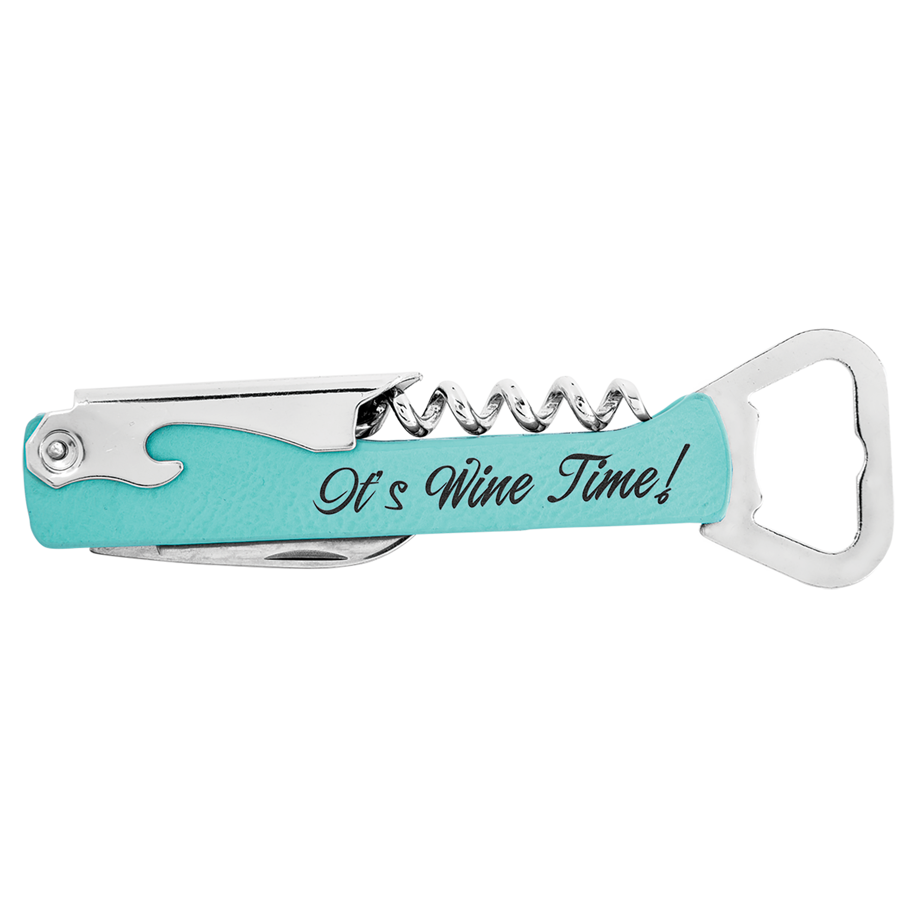 This leatherette wine and bottle opener offers the look and feel of genuine leather at a fraction of the price. This richly textured, synthetic material is water resistant, easy to clean and durable enough for the rigors of daily use. The high quality workmanship of each leatherette piece is sure to impress every recipient with its elegant individuality. This opener can be personalized through laser engraving.  Great for client, birthday and batchlor/batchorette gifts.  Pair with a bottle of wine in a basket for the perfect gift!