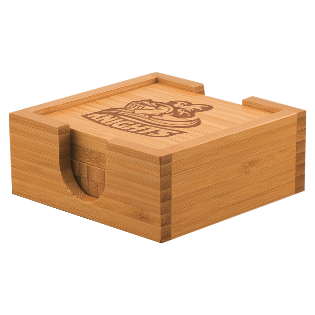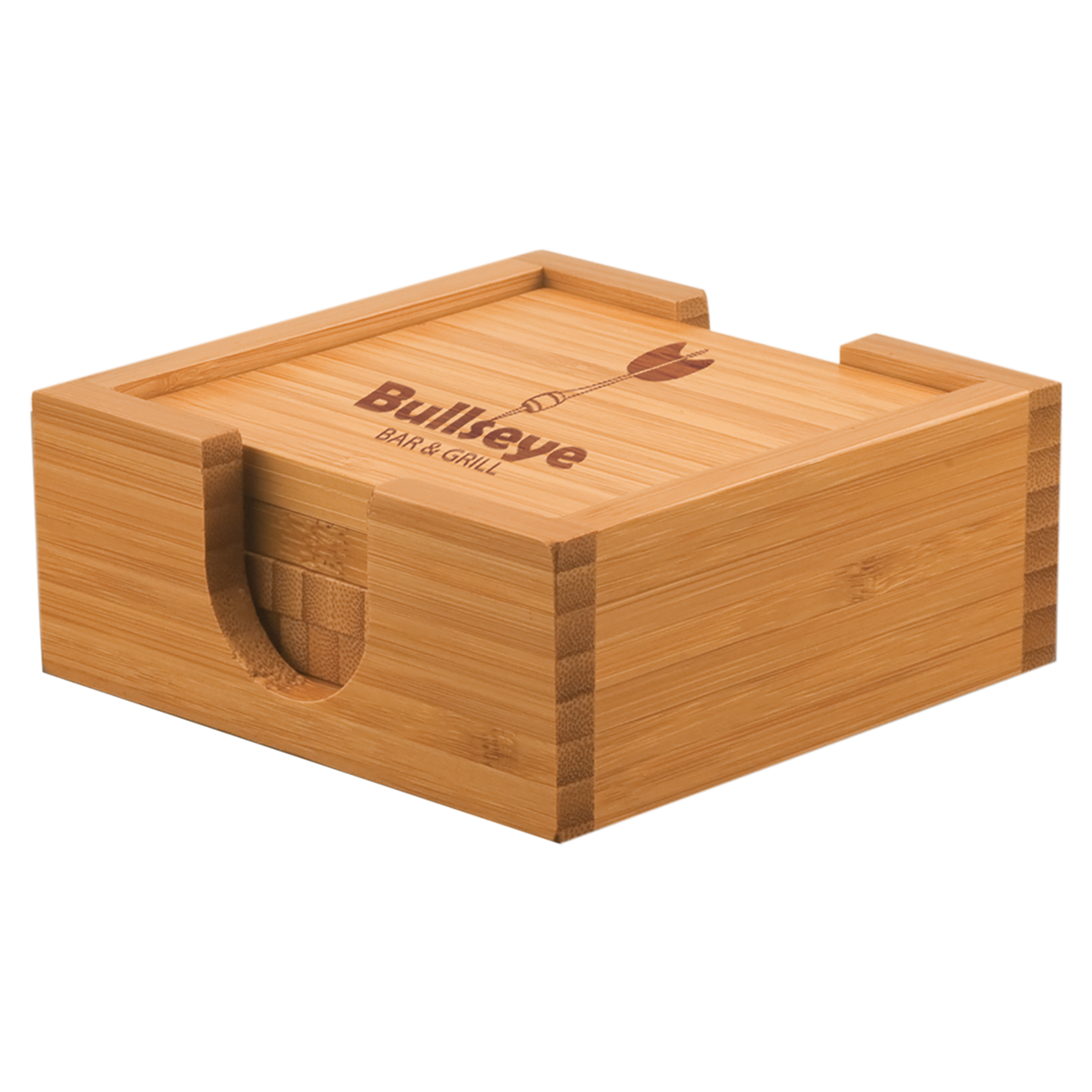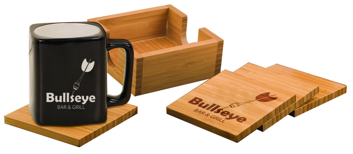 Gift an eco-friendly customized Bamboo coaster set and your laser engraved company logo, school name, monogram or other design will display prominently for all to see. This five piece coaster set includes four bamboo coasters and a bamboo caddy for storage. Each coaster comes with 4 felt pads on the bottom to prevent surface scratches.