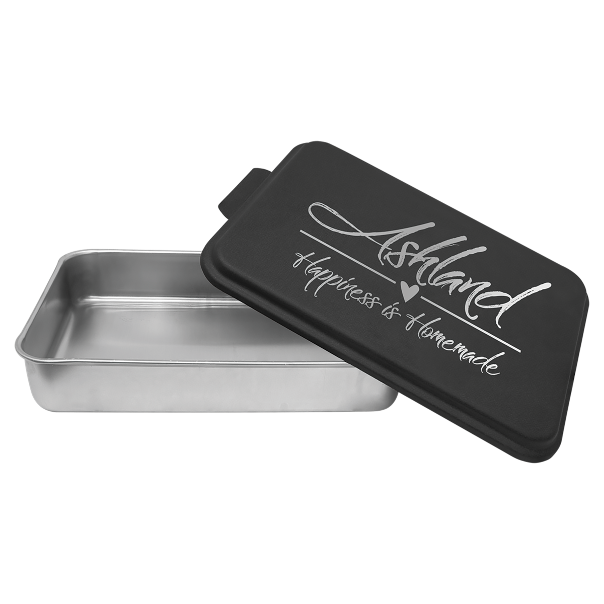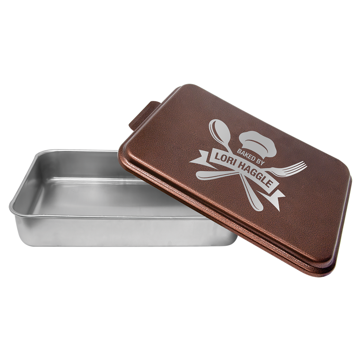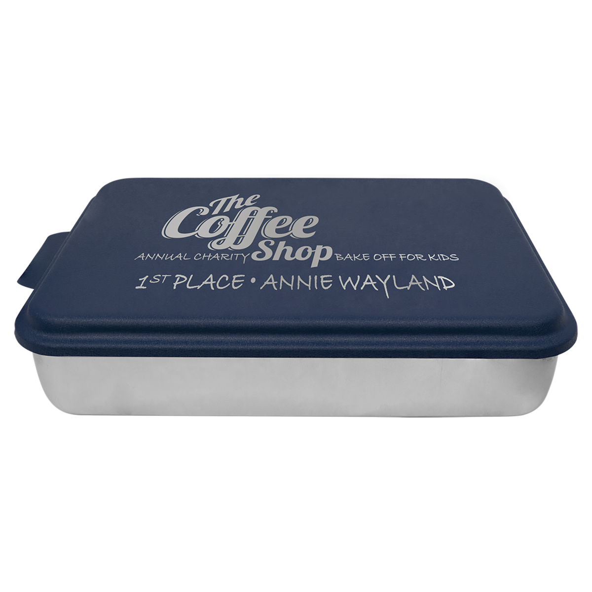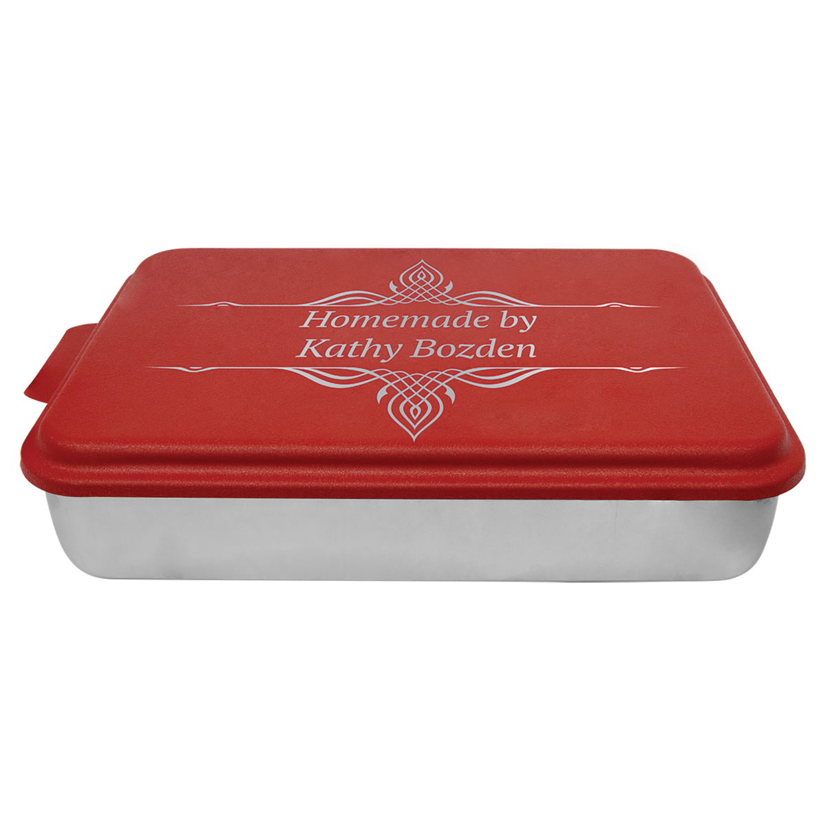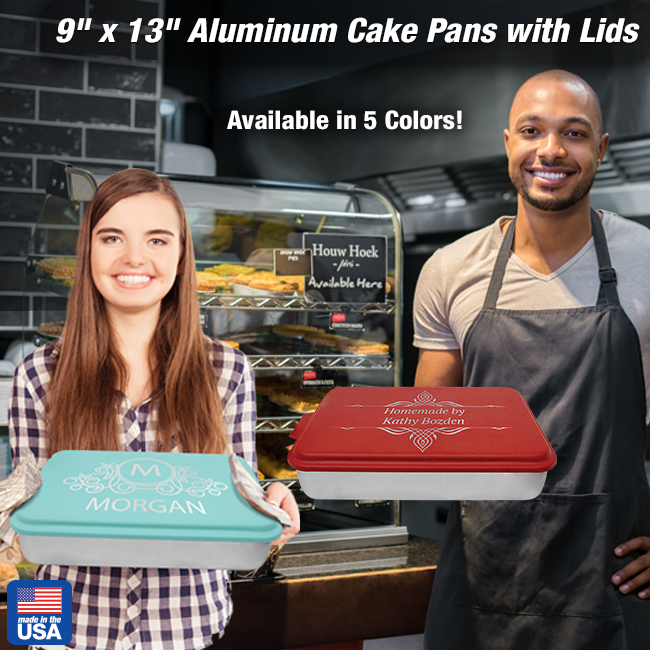 9 x 13 Aluminum Cake Pans are something almost anyone can use. These sturdy pans have a powder coated lid that snaps on easily and securely and can be personalized! Add a monogram or name to personalize for a house warming, wedding, or bridal shower! Customize with a logo or other graphics to create the perfect award for a bake off! Also makes a great client gift.  The possibilities are many, and with lids available in five beautiful colors there is one to fit anyone's decor!